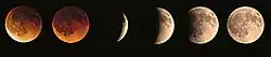 There are three types of lunar eclipses: penumbral, when the Moon crosses only the Earth's penumbra; partial, when the Moon crosses partially into the Earth's umbra; and total, when the Moon crosses entirely into the Earth's umbra. Total lunar eclipses pass through all three phases. Even during a total lunar eclipse, however, the Moon is not completely dark. Sunlight refracted through the Earth's atmosphere enters the umbra and provides a faint illumination. Much as in a sunset, the atmosphere tends to more strongly scatter light with shorter wavelengths, so the illumination of the Moon by refracted light has a red hue,[17] thus the phrase 'Blood Moon' is often found in descriptions of such lunar events as far back as eclipses are recorded.[18]