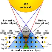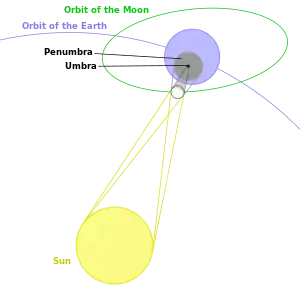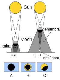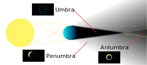 Typically the cross-section of the objects involved in an astronomical eclipse is roughly disk-shaped.[7] The region of an object's shadow during an eclipse is divided into three parts:[8]