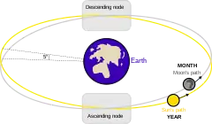 An eclipse involving the Sun, Earth, and Moon can occur only when they are nearly in a straight line, allowing one to be hidden behind another, viewed from the third. Because the orbital plane of the Moon is tilted with respect to the orbital plane of the Earth (the ecliptic), eclipses can occur only when the Moon is close to the intersection of these two planes (the nodes). The Sun, Earth and nodes are aligned twice a year (during an eclipse season), and eclipses can occur during a period of about two months around these times. There can be from four to seven eclipses in a calendar year, which repeat according to various eclipse cycles, such as a saros.