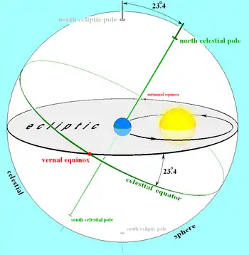 Because Earth's rotational axis is not perpendicular to its orbital plane, Earth's equatorial plane is not coplanar with the ecliptic plane, but is inclined to it by an angle of about 23.4°, which is known as the obliquity of the ecliptic.[8] If the equator is projected outward to the celestial sphere, forming the celestial equator, it crosses the ecliptic at two points known as the equinoxes. The Sun, in its apparent motion along the ecliptic, crosses the celestial equator at these points, one from south to north, the other from north to south.[5] The crossing from south to north is known as the March equinox, also known as the first point of Aries and the ascending node of the ecliptic on the celestial equator.[9] The crossing from north to south is the September equinox or descending node.