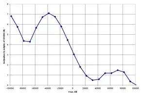 Inclination of the ecliptic over 200,000 years, from Dziobek (1892).[26] This is the inclination to the ecliptic of 101,800 CE. Note that the ecliptic rotates by only about 7° during this time, whereas the celestial equator makes several complete cycles around the ecliptic. The ecliptic is a relatively stable reference compared to the celestial equator.