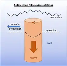 Conceptually, eddy pumping associates the vertical motion in the interior of eddies to temporal changes in eddy relative vorticity.[3] The vertical motion created by the change in vorticity is understood from the characteristics of the water contained in the core of the eddy. Cyclonic eddies rotate anticlockwise (clockwise) in the Northern (Southern) hemisphere and have a cold core. Anticyclonic eddies rotate clockwise (anticlockwise) in the Northern (Southern) hemisphere and have a warm core. The temperature and salinity difference between the eddy core and the surrounding waters is the key element driving vertical motion. While propagating in horizontal direction, Cyclones and anticyclones “bend” the pycnocline upwards and downwards, respectively, induced by this temperature and salinity discrepancy. The extent of the vertical perturbation of the density surface inside the eddy (compared to the mean ocean density surface) is determined by the changes in rotational strength (relative vorticity) of the eddy.[5]