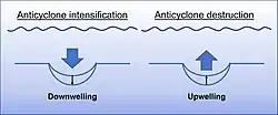 Eddies weaken over time due to kinetic energy dissipation. As eddies form and intensify, the mechanisms mentioned above will strengthen and, as an increase in relative vorticity generates perturbations of the isopycnal surfaces, the pycnocline deforms. On the other hand, when eddies have aged and carry low kinetic energy, their vorticity diminishes and leads to eddy destruction. Such process opposes to eddy formation and intensification, as the pycnocline will return to its original position prior to the eddy-induced deformation. This means that the pycnocline will uplift in anticyclones and compress in cyclones, leading to upwelling and downwelling, respectively.[3]