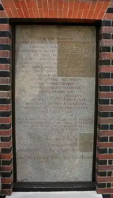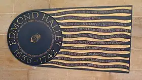 Halley succeeded John Flamsteed in 1720 as Astronomer Royal, a position Halley held until his death in 1742 at the age of 85.[14] He was buried in the graveyard of the old church of St Margaret's, Lee (since rebuilt), at Lee Terrace, Blackheath.[61] He was interred in the same vault as the Astronomer Royal John Pond; the unmarked grave of the Astronomer Royal Nathaniel Bliss is nearby.[62] His original tombstone was transferred by the Admiralty when the original Lee church was demolished and rebuilt – it can be seen today on the southern wall of the Camera Obscura at the Royal Observatory, Greenwich. His marked grave can be seen at St Margaret's Church, Lee Terrace.[63][64]