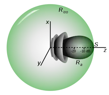 If the signal path is in free space (line-of-sight propagation with no multipath) the signal strength (power flux density in watts per square meter) of the radio signal on the main lobe axis at any particular distance from the antenna can be calculated from the EIRP or ERP. Since an isotropic antenna radiates equal power flux density over a sphere centered on the antenna, and the area of a sphere with radius is then