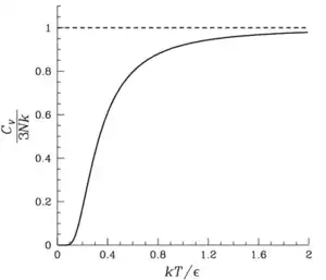 The quantity has the dimensions of temperature and is a characteristic property of a crystal. It is known as the Einstein temperature.[2] Hence, the Einstein crystal model predicts that the energy and heat capacities of a crystal are universal functions of the dimensionless ratio . Similarly, the Debye model predicts a universal function of the ratio , where is the Debye temperature.