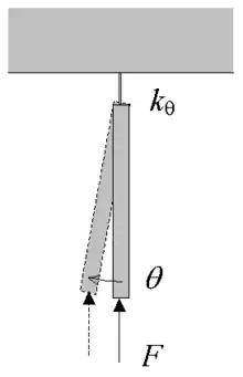 Consider as a simple example a rigid beam of length L, hinged in one end and free in the other, and having an angular spring attached to the hinged end. The beam is loaded in the free end by a force F acting in the compressive axial direction of the beam, see the figure to the right.