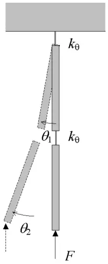 By attaching another rigid beam to the original system by means of an angular spring a two degrees of freedom-system is obtained. Assume for simplicity that the beam lengths and angular springs are equal. The equilibrium conditions become