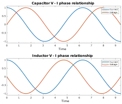 The phase angles in the equations for the impedance of capacitors and inductors indicate that the voltage across a capacitor lags the current through it by a phase of , while the voltage across an inductor leads the current through it by . The identical voltage and current amplitudes indicate that the magnitude of the impedance is equal to one.