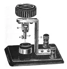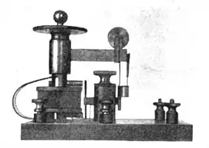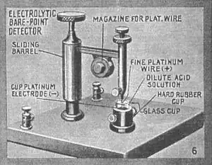 The electrolytic detector, or liquid barretter, was a type of detector (demodulator) used in early radio receivers. First used by Canadian radio researcher Reginald Fessenden in 1903, it was used until about 1913, after which it was superseded by crystal detectors and vacuum tube detectors such as the Fleming valve and Audion (triode).[1][2] It was considered very sensitive and reliable compared to other detectors available at the time such as the magnetic detector and the coherer.[3] It was one of the first rectifying detectors, able to receive AM (sound) transmissions. On December 24, 1906, US Naval ships with radio receivers equipped with Fessenden's electrolytic detectors received the first AM radio broadcast from Fessenden's Brant Rock, Massachusetts transmitter, consisting of a program of Christmas music.[4][5]