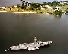 EMPRESS I (antennas along shoreline) with USS Estocin (FFG-15) moored in the foreground for testing.