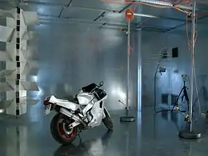 An electromagnetic reverberation chamber (also known as a reverb chamber (RVC) or mode-stirred chamber (MSC)) is an environment for electromagnetic compatibility (EMC) testing and other electromagnetic investigations. Electromagnetic reverberation chambers have been introduced first by H.A. Mendes in 1968.[1] A reverberation chamber is screened room with a minimum of absorption of electromagnetic energy. Due to the low absorption very high field strength can be achieved with moderate input power. A reverberation chamber is a cavity resonator with a high Q factor. Thus, the spatial distribution of the electrical and magnetic field strengths is strongly inhomogeneous (standing waves). To reduce this inhomogeneity, one or more tuners (stirrers) are used. A tuner is a construction with large metallic reflectors that can be moved to different orientations in order to achieve different boundary conditions. The Lowest Usable Frequency (LUF) of a reverberation chamber depends on the size of the chamber and the design of the tuner. Small chambers have a higher LUF than large chambers.