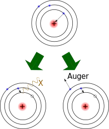 Following capture of an inner electron from the atom, an outer electron replaces the electron that was captured and one or more characteristic X-ray photons is emitted in this process. Electron capture sometimes also results in the Auger effect, where an electron is ejected from the atom's electron shell due to interactions between the atom's electrons in the process of seeking a lower energy electron state.