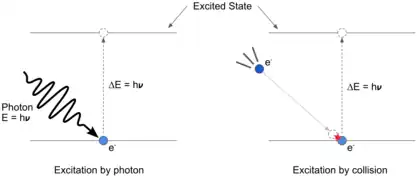 In general, the excitation of electrons in atoms strongly varies from excitation in solids, due to the different nature of the electronic levels and the structural properties of some solids.[6] The electronic excitation (or deexcitation) can take place by several processes such as: