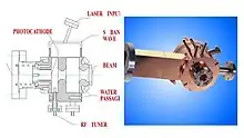 An RF electron gun[1] consists of a Microwave cavity, either single cell or multi-cell, and a cathode. In order to obtain a smaller beam emittance at a given beam current, a photocathode is used.[2] An RF electron gun with a photocathode is called a photoinjector.
