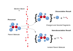 In this process, an electron from the analyte molecule (M) is expelled during the collision process to convert the molecule to a positive ion with an odd number of electrons. The following gas phase reaction describes the electron ionization process[10]