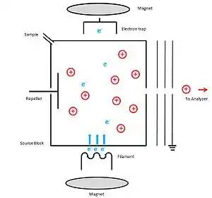 A schematic diagram of instrumentation which can be used for electron ionization is shown to the right. The ion source block is made out of metal. As the electron source, the cathode, which can be a thin filament of tungsten or rhenium wire, is inserted through a slit to the source block. Then it is heated up to an incandescent temperature to emit electrons. A potential of 70 V is applied between the cathode and source block to accelerate them to 70 eV kinetic energy to produce positive ions. The potential of the anode (electron trap) is slightly positive and it is placed on the outside of the ionization chamber, directly opposite to the cathode. The unused electrons are collected by this electron trap. The sample is introduced through the sample hole. To increase the ionization process, a weak magnetic field is applied parallel to the direction of the electrons' travel. Because of this, electrons travel in a narrow helical path, which increases their path length. The positive ions that are generated are accelerated by the repeller electrode into the accelerating region through the slit in the source block. By applying a potential to the ion source and maintaining the exit slit at ground potential, ions enter the mass analyzer with a fixed kinetic energy. To avoid the condensation of the sample, the source block is heated to approximately 300 °C.[5]