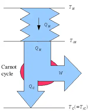 Consider a heat engine, with a single working fluid cycling around the engine. On one side, the working fluid has temperature , and is in direct contact with the hot heat bath. On the other side, it has temperature , and is in direct contact with the cold heat bath.
