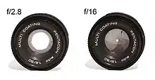 In photography, the size of the entrance pupil (rather than the size of the physical aperture stop) is used to calibrate the opening and closing of the diaphragm aperture. The f-number ("relative aperture"), N, is defined by N = f / EN, where f is the focal length and EN is the diameter of the entrance pupil.[2] Increasing the focal length of a lens (i.e., zooming in) will usually cause the f-number to increase, and the entrance pupil location to move further back along the optical axis.