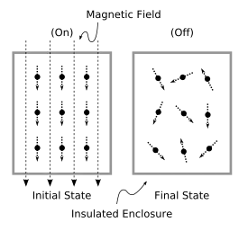 In the quest for ultra-cold temperatures, a temperature lowering technique called adiabatic demagnetization is used, where atomic entropy considerations are utilized which can be described in order-disorder terms.[23] In this process, a sample of solid such as chrome-alum salt, whose molecules are equivalent to tiny magnets, is inside an insulated enclosure cooled to a low temperature, typically 2 or 4 kelvins, with a strong magnetic field being applied to the container using a powerful external magnet, so that the tiny molecular magnets are aligned forming a well-ordered "initial" state at that low temperature. This magnetic alignment means that the magnetic energy of each molecule is minimal.[24] The external magnetic field is then reduced, a removal that is considered to be closely reversible. Following this reduction, the atomic magnets then assume random less-ordered orientations, owing to thermal agitations, in the "final" state:
