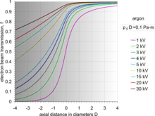 By the use of differential pumping, an electron beam is generated and propagated freely in the vacuum of the upper column, from the electron gun down to PLA2, from which point onwards the electron beam gradually loses electrons due to electron scattering by gas molecules. Initially, the amount of electron scattering is negligible inside the intermediate cavity, but as the beam encounters an increasingly denser gas jet formed by the PLA1, the losses become significant.[29] After the beam enters the specimen chamber, the electron losses increase exponentially at a rate depending on the prevailing pressure, the nature of gas and the acceleration voltage of the beam. The fraction of beam transmitted along the PLA1 axis can be seen by a set of characteristic curves for a given product p0D,[29] where D is the aperture diameter. Eventually, the electron beam becomes totally scattered and lost, but before this happens, a useful amount of electrons is retained in the original focused spot over a finite distance, which can still be used for imaging. This is possible because the removed electrons are scattered and distributed over a broad area like a skirt (electron skirt) surrounding the focused spot.[31] Because the electron skirt width is orders of magnitude greater than the spot width, with orders of magnitude less current density, the skirt contributes only background (signal) noise without partaking in the contrast generated by the central spot. The particular conditions of pressure, distance and beam voltage over which the electron beam remains useful for imaging purposes has been termed oligo-scattering regime[32] in distinction from single-, plural- and multiple-scattering regimes used in prior literature.