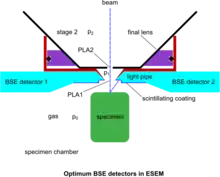 Despite the above developments, devoted BSE detectors in the ESEM have played an important role, since the BSE remain a most useful detection mode yielding information not possible to obtain with SE. The conventional BSE detection means have been adapted to operate in the gaseous conditions of the ESEM. The BSE having a high energy are self-propelled to the corresponding detector without significant obstruction by the gas molecules. Already, annular or quadrant solid-state detectors have been employed for this purpose but their geometry is not easily adaptable to the requirements of ESEM for optimum operation. As a result, no much use has been reported of these detectors on genuine ESEM instruments at high pressure. The "Robinson" BSE detector[38] is tuned for operation up to around 100 Pa at the usual working distance of conventional SEM for the suppression of specimen charging, whilst electron collection at the short working distance and high pressure conditions make it inadequate for the ESEM. However, plastic scintillating materials being easily adaptable have been used for BSE and made to measure according to the strictest requirements of the system. Such work culminated in the use of a pair of wedge-shaped detectors saddling a conical PLA1 and abutting to its rim, so that the dead detection space is reduced to a minimum, as shown in the accompanying figure of optimum BSE detectors.[14] The photon conduction is also optimized by the geometry of the light pipes, whilst the pair of symmetrical detectors allow the separation of topography (signal subtraction) and atomic number contrast (signal addition) of the specimen surface to be displayed with the best ever signal-to-noise-ratio. This scheme has further allowed the use of color by superimposing various signals in a meaningful way.[39] These simple but special detectors became possible in the conditions of ESEM, since bare plastic does not charge by the BSE. However, a very fine wire mesh with appropriate spacing has been proposed[40] as a GDD when gas is present and to conduct negative charge away from the plastic detectors when the gas is pumped out, towards a universal ESEM. Furthermore, since the associated electronics involve a photomultiplier with a wide frequency response, true TV scanning rates are readily available. This is an essential attribute to maintain with an ESEM that enables the examination of processes in situ in real time. In comparison, no such imaging has been reported with the electron avalanche mode of the GDD yet.