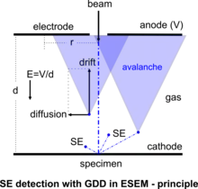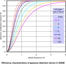 In a simple form, the gaseous detection device (GDD) employs an electrode with a voltage up to several hundred volts to collect the secondary electrons in the ESEM. The principle of this SE detector is best described by considering two parallel plates at a distance d apart with a potential difference V generating a uniform electric field E = V/d, and is shown in the accompanying diagram of the GDD.[17][27] Secondary electrons released from the specimen at the point of beam impingement are driven by the field force towards the anode electrode but the electrons also move radially due to thermal diffusion from collisions with the gas molecules. The variation of electron collection fraction R within anode radius r vs. r/d, for fixed values of anode bias V, at constant product of (pressure·distance) p·d = 1 Pa·m, is given by the accompanying characteristic curves of efficiency of the GDD. All of the secondary electrons are detected if the parameters of this device are properly designed. This clearly shows that practically 100% efficiency is possible within a small radius of collector electrode with only moderate bias. At these levels of bias, no catastrophic discharge takes place. Instead, a controlled proportional multiplication of electrons is generated as the electrons collide with gas molecules releasing new electrons on their way to the anode. This principle of avalanche amplification operates similarly to proportional counters used to detect high energy radiation. The signal thus picked up by the anode is further amplified and processed to modulate a display screen and form an image as in SEM. Notably, in this design and the associated gaseous electron amplification, the product p·d is an independent parameter, so that there is a wide range of values of pressure and electrode geometry which can be described by the same characteristics. The consequence of this analysis is that the secondary electrons are possible to detect in a gaseous environment even at high pressures, depending on the engineering efficacy of any given instrument.