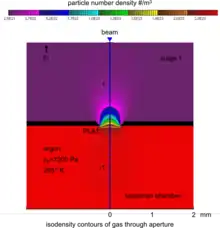 The specimen chamber sustaining the high-pressure gaseous environment is separated from the high vacuum of the electron optics column with at least two small orifices customarily referred to as pressure-limiting apertures (PLA). The gas leaking through the first aperture (PLA1) is quickly removed from the system with a pump that maintains a much lower pressure in the downstream region (i.e. immediately above the aperture).[14] This is called differential pumping. Some gas escapes further from the low pressure region (stage 1) through a second pressure limiting aperture (PLA2) into the vacuum region of the column above, which constitutes a second stage differential pumping (stage 2). A schematic diagram shows the basic ESEM gas pressure stages including the specimen chamber, intermediate cavity and upper electron optics column.[27] The corresponding pressures achieved are p0>>p1>>p2, which is a sufficient condition for a microscope employing a tungsten type of electron gun. Additional pumping stages may be added to achieve an even higher vacuum as required for a LaB6 and field emission type electron guns. The design and shape of a pressure limiting aperture are critical in obtaining the sharpest possible pressure gradient (transition) through it. This is achieved with an orifice made on a thin plate and tapered in the downstream direction as shown in the accompanying isodensity contours of a gas flowing through the PLA1. This was done with a computer simulation of the gas molecule collisions and movement through space in real time.[28][29] We can immediately see in the figure of the isodensity contours of gas through aperture that the gas density decreases by about two orders of magnitude over the length of a few aperture radii. This is a quantitatively vivid demonstration of a first principle that enables the separation of the high-pressure specimen chamber from the low pressure and vacuum regions above.