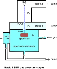 The majority of available instruments vent their specimen chamber to the ambient pressure (100 kPa) with every specimen transfer. A large volume of gas has to be pumped out and replaced with the gas of interest, usually water vapor supplied from a water reservoir connected to the chamber via some pressure regulating (e.g. needle) valve. In many applications this presents no problem, but with those ones requiring uninterrupted 100% relative humidity, it has been found that the removal of ambient gas is accompanied by lowering the relative humidity below the 100% level during specimen transfer.[50] This clearly defeats the very purpose of ESEM for this class of applications. However, such a problem does not arise with the original prototype ESEM using an intermediate specimen transfer chamber, so that the main chamber is always maintained at 100% relative humidity without interruption during a study.[51] The specimen transfer chamber (tr-ch) shown in the diagram of ESEM gas pressure stages contains a small water reservoir so that the initial ambient air can be quickly pumped out and practically instantaneously replaced with water vapor without going through a limited conductance tube and valve. The main specimen chamber can be maintained at 100% relative humidity, if the only leak of vapor is through the small PLA1, but not during violent pumping with every specimen change. Once the wet specimen is in equilibrium with 100% relative humidity in the transfer chamber, within seconds, a gate valve opens and the specimen is transferred in the main specimen chamber maintained at the same pressure. An alternative approach involving controlled pumping of the main chamber[50] may not solve the problem entirely either because the 100% relative humidity cannot be approached monotonically without any drying, or the process is very slow; inclusion of a water reservoir inside the main chamber means that one cannot lower the relative humidity until after all of the water is pumped out (i.e. a defective control of the relative humidity).