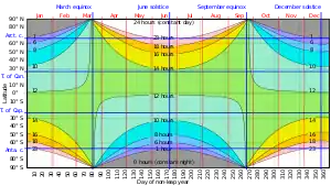 The Sun culminates at no more than 20° altitude and its daily path at sunrise and sunset is at a shallow 20° angle to the horizon. Twilight lasts for more than four hours.