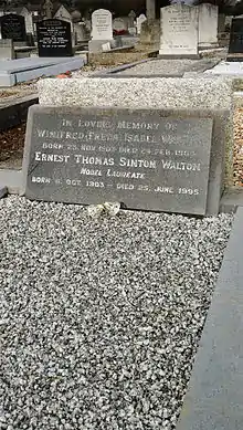 Ernest Walton married Winifred Wilson, a Methodist minister's daughter, in 1934.[18] Their four children are Alan Walton (a physicist at the University of Cambridge), Marian Woods, Philip Walton (Professor of Applied Physics, NUI Galway), and Jean Clarke.[1] He served on a committee of Wesley College, Dublin.[18]
