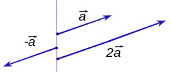 If r is negative, then the vector changes direction: it flips around by an angle of 180°. Two examples (r = −1 and r = 2) are given below:
