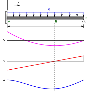 Another commonly encountered statically indeterminate beam problem is the cantilevered beam with the free end supported on a roller.[5] The bending moments, shear forces, and deflections of such a beam are listed below: