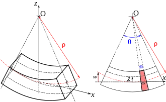 Let be the length of an element of the neutral surface in the undeformed state. For small deflections, the element does not change its length after bending but deforms into an arc of a circle of radius . If is the angle subtended by this arc, then .