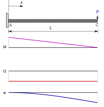 Another important class of problems involves cantilever beams. The bending moments (), shear forces (), and deflections () for a cantilever beam subjected to a point load at the free end and a uniformly distributed load are given in the table below.[5]