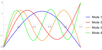 The quantities are called the natural frequencies of the beam. Each of the displacement solutions is called a mode, and the shape of the displacement curve is called a mode shape.