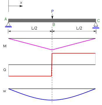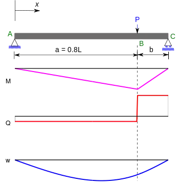 The three-point bending test is a classical experiment in mechanics. It represents the case of a beam resting on two roller supports and subjected to a concentrated load applied in the middle of the beam. The shear is constant in absolute value: it is half the central load, P / 2. It changes sign in the middle of the beam. The bending moment varies linearly from one end, where it is 0, and the center where its absolute value is PL / 4, is where the risk of rupture is the most important. The deformation of the beam is described by a polynomial of third degree over a half beam (the other half being symmetrical). The bending moments (), shear forces (), and deflections () for a beam subjected to a central point load and an asymmetric point load are given in the table below.[5]