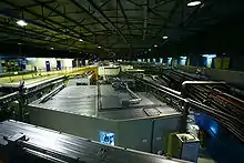 The ESRF physical plant consists of two main buildings: the experiment hall, containing the 844 metre circumference ring and forty tangential beamlines; and a block of laboratories, preparation suites, and offices connected to the ring by a pedestrian bridge. The linear accelerator electron gun and smaller booster ring used to bring the beam to an operating energy of 6 GeV are constructed within the main ring. Until recently bicycles were provided for use indoors in the ring's circumferential corridor. Unfortunately they have been removed after some minor accidents. But even before this it was not possible to cycle continuously all the way around, since some of the beamlines exit the hall.
