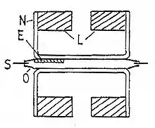 Dennis F. Evans described the original Evans balance in 1973, based on a torsional balance developed by Alexander Rankine in 1937. Evans used Ticonal bars with cadmium-plated mild steel yokes as the magnets and a Johnson Matthey gold alloy (hence the other name of the balance) for the suspension strip, glued together with epoxy resin onto a phosphor brown spacer. The tubes were made from NMR tubes and the current came from CdS photocells.[5] This original was modified with help from the Johnson Matthey company. Two pairs of magnets were glued between the arms of an H-frame. The sample was placed into the gap between one pair of magnets and a small coil in the gap between the second pair of magnets. This entire construction pivoted horizontally around a torsion strip. When a sample tube was placed between the first pair of magnets, the torsional force was restored by the current passed through the coil between the second pair of magnets, giving a reading on a display instead of a Helipot potentiometer.[6]