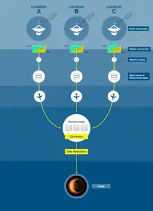 The EHT is composed of many radio observatories or radio-telescope facilities around the world, working together to produce a high-sensitivity, high-angular-resolution telescope. Through the technique of very-long-baseline interferometry (VLBI), many independent radio antennas separated by hundreds or thousands of kilometres can act as a phased array, a virtual telescope which can be pointed electronically, with an effective aperture which is the diameter of the entire planet, substantially improving its angular resolution.[16] The effort includes development and deployment of submillimeter dual polarization receivers, highly stable frequency standards to enable very-long-baseline interferometry at 230–450 GHz, higher-bandwidth VLBI backends and recorders, as well as commissioning of new submillimeter VLBI sites.[17]