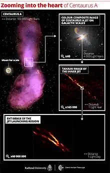 In July 2021, high resolution images of the jet produced by the supermassive black hole sitting at the center of Centaurus A were released. With a mass around 5.5×107 M☉, the black hole is not large enough for its photon sphere to be observed, as in EHT images of Messier M87*, but its jet extends even beyond its host galaxy while staying as a highly collimated beam which is a point of study. Edge-brightening of the jet was also observed which would exclude models of particle acceleration that are unable to reproduce this effect. The image was 16 times sharper than previous observations and utilized a 1.3 mm wavelength.[49][50][51]
