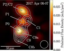 It was observed with the Event Horizon Telescope on 2017 April 5−7, when NRAO 530 was used as a calibrator for the EHT observations of Sagittarius A*. The observations were performed with the full EHT 2017 array of eight telescopes located at six geographical sites. At z = 0.902, this is the most distant object imaged by the EHT so far. The team reconstructed the first images of the source at 230 GHz, at an angular resolution of ~20 μas, both in total intensity and in linear polarization (LP). Source variability was not detected, that allowed to represent the whole data set with static images. The images reveal a bright feature located on the southern end of the jet, which was associated with the core. The feature is linearly polarized, with a fractional polarization of ~5%–8%, and it has a substructure consisting of two components. Their observed brightness temperature suggests that the energy density of the jet is dominated by the magnetic field. The jet extends over 60 μas along a position angle ~ −28°. It includes two features with orthogonal directions of polarization (electric vector position angle), parallel and perpendicular to the jet axis, consistent with a helical structure of the magnetic field in the jet. The outermost feature has a particularly high degree of LP, suggestive of a nearly uniform magnetic field.[56]