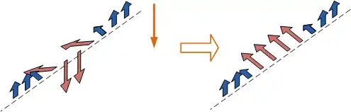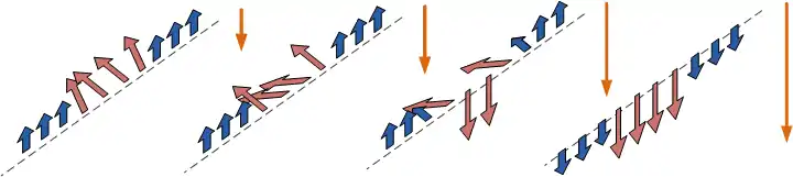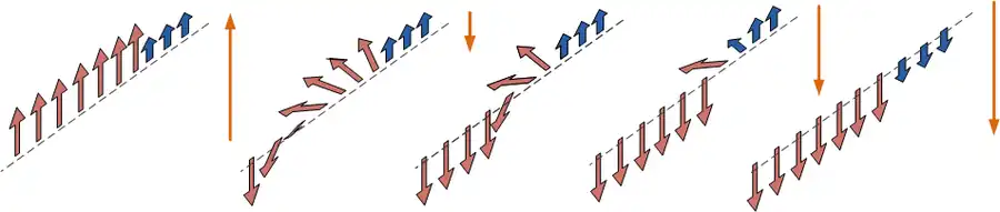 From left to right in Figure 3, an external field is first applied in an upward direction in order to saturate the magnet. Then, the external field is reversed and starts to demagnetize the magnet. Since the coercivity of the hard phase is relatively high, the moments remain unchanged so as to minimize the anisotropy and exchange energy. The magnetic moments in the soft phase start rotating to align with the applied field.[5] Because of the exchange coupling at the soft/hard interface, the magnetic moments at the soft phase boundary have to align with the adjacent moment in hard phase. At the regions close to the interface, because of exchange coupling, the chain of magnetic moments acts like a spring. If the external field is increased, more moments in soft phase rotate downward, and the width of the transition region becomes smaller as the exchange energy density increases. The magnetic moments in the hard phase do not rotate until the external field is high enough that the exchange energy density in the transition region is comparable to the anisotropy energy density in the hard phase. At this point, the rotation of magnetic moments in the soft phase starts to affect the hard phase. As the external field surpasses the hard material's coercivity, the hard magnet gets fully demagnetized.
