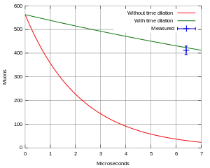 If no time dilation exists, then those muons should decay in the upper regions of the atmosphere, however, as a consequence of time dilation they are present in considerable amount also at much lower heights. The comparison of those amounts allows for the determination of the mean lifetime as well as the half-life of muons. is the number of muons measured in the upper atmosphere, at sea level, is the travel time in the rest frame of the Earth by which the muons traverse the distance between those regions, and is the mean proper lifetime of the muons:[3]