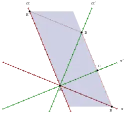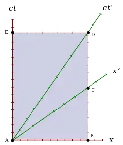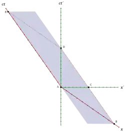 Time: The interval between two events present on the worldline of a single clock is called proper time, an important invariant of special relativity. As the origin of the muon at A and the encounter with Earth at D is on the muon's worldline, only a clock comoving with the muon and thus resting in S′ can indicate the proper time T′0=AD. Due to its invariance, also in S it is agreed that this clock is indicating exactly that time between the events, and because it is in motion here, T′0=AD is shorter than time T indicated by clocks resting in S. This can be seen at the longer intervals T=BD=AE parallel to the ct-axis.