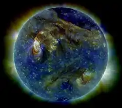 Extreme ultraviolet composite image of the Sun (red: 21.1 nm, green: 19.3 nm, blue: 17.1 nm) taken by the Solar Dynamics Observatory on August 1, 2010