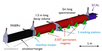 Located at the front end of FASER is the FASERν neutrino detector. It consists of many layers of emulsion films interleaved with tungsten plates as target material for neutrino interactions. Behind FASERν and at the entrance to the main detector is a charged particle veto consisting of plastic scintillators.[23][24] This is followed by a 1.5 meter long empty decay volume and a 2 meter long spectrometer, which are placed in a 0.55 T magnetic field. The spectrometer consists of three tracking stations, composed of layers of precision silicon strip detectors, to detect charged particles produced in the decay of long-lived particles. Located at the end is an electromagnetic calorimeter.