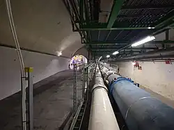 The experiment is installed in the service tunnel TI12, which is 480 m downstream from the interaction point used by the ATLAS experiment.[3] This tunnel was formerly used to inject the beam from the SPS into the LEP accelerator. In this location, the FASER experiment is placed into an intense and highly collimated beam of both neutrinos as well as possible new particles. Additionally, it is shielded from ATLAS by about 100 meters of rock and concrete, providing a low background environment. The FASER experiment was approved in 2019.[4][5] The detector was built in the following two years and installed in 2021.[6] The experiment started taking data at the beginning of Run 3 of the LHC in summer 2022.[7][8][9]
