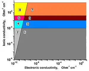 Superionic conductors where σi is more than 0.1 Ω−1 cm−1 (300 K) and the activation energy for ion transport Ei is small (about 0.1 eV), are called advanced superionic conductors. The most famous example of advanced superionic conductor-solid electrolyte is RbAg4I5 where σi > 0.25 Ω−1 cm−1 and σe ~10−9 Ω−1 cm−1 at 300 K.[1][2] The Hall (drift) ionic mobility in RbAg4I5 is about 2×10−4 cm2/(V•s) at room temperatures.[3] The σe – σi systematic diagram distinguishing the different types of solid-state ionic conductors is given in the figure.[4][5]