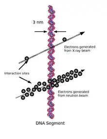 Because the electrons produced from X-rays have high energy and low LET, when they interact with a cell typically only a few ionizations will occur. It is likely then that the low LET radiation will cause only single strand breaks of the DNA helix. Single strand breaks of DNA molecules can be readily repaired, and so the effect on the target cell is not necessarily lethal. By contrast, the high LET charged particles produced from neutron irradiation cause many ionizations as they traverse a cell, and so double-strand breaks of the DNA molecule are possible. DNA repair of double-strand breaks are much more difficult for a cell to repair, and more likely to lead to cell death.